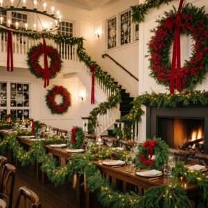 Popular decorations include fairy lights, evergreen garlands, wreaths, candles, festive centerpieces, and Christmas trees.