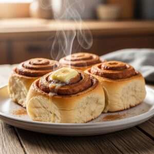 Soft, gooey cinnamon rolls straight from the oven, topped with butter and a sprinkle of cinnamon.