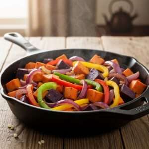 A hearty, spiced hash made with sweet potatoes, onions, and bell peppers.