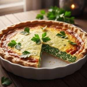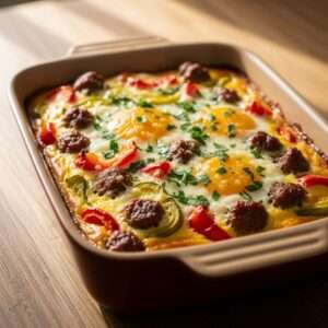 A hearty combination of eggs, cheese, sausage, and vegetables baked to perfection.