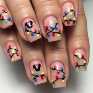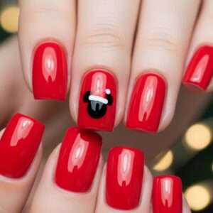 Paint most nails red or nude and create a small Mickey head wearing a Santa hat on one accent nail. Simple, festive, and instantly recognizable.
