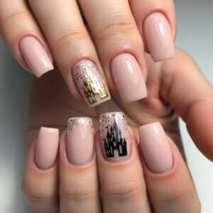 Use nude or light pink nails and paint a tiny simple gold or black castle outline on an accent nail.