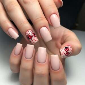 A nude or pastel base with a small red bow painted on a single nail for Minnie-inspired simplicity.