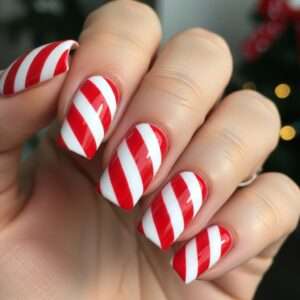 Red and white diagonal stripes on one or two nails, inspired by Minnie or festive candy canes. Simple and quick to create.