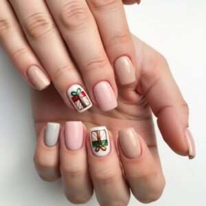 Paint small gift boxes on accent nails using red, green, or gold. One or two nails are enough for a simple holiday vibe.