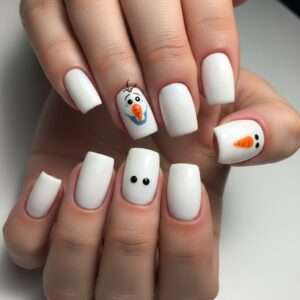 White nail base with a small orange triangle for Olaf’s carrot nose and two black dots for eyes.