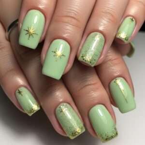 Light green nail with a tiny gold star or glitter accent. Minimal effort but magical and festive.