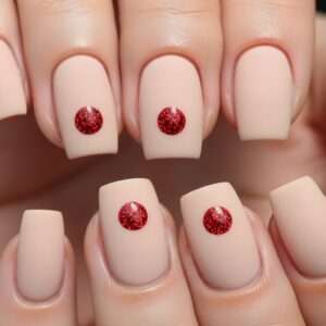 Neutral nails with one red glitter dot on the ring finger to represent Rudolph’s nose. Minimalist, cute, and festive.
