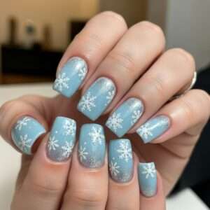 White or light blue nails with a single small snowflake on each nail. Add a subtle glitter top coat to make it holiday-ready.