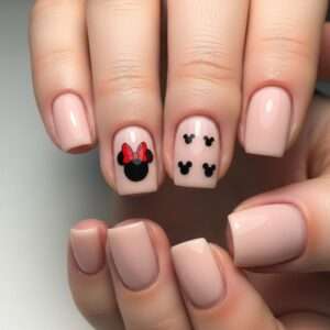Paint a tiny red bow on one nail (Minnie) and black dot Mickey ears on another. Keep the rest neutral or nude for a minimalist Disney holiday look.