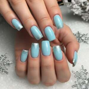 Light blue nails with glitter tips for an icy look, reminiscent of Elsa’s magic. No detailed painting required.