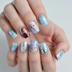 Use icy blue, white, and silver shades to create snowflake patterns and add small character faces or silhouettes on short nails.