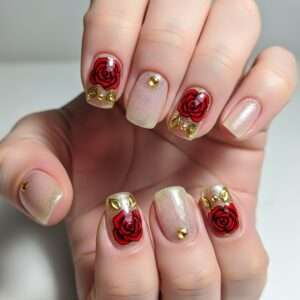 Belle from Beauty and the Beast is known for her love of roses. Short nails can feature tiny red roses with glitter accents, combined with golden hues or soft neutrals.