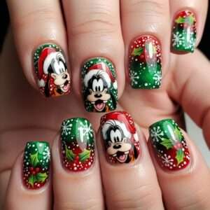 Short nails can feature Goofy’s face, a red-and-white Santa hat, or small gift boxes.