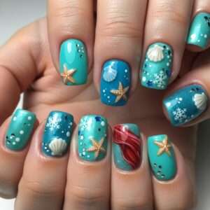 Short nails can be painted in shades of turquoise and blue, with small seashells, starfish, and hints of red for Ariel’s hair.