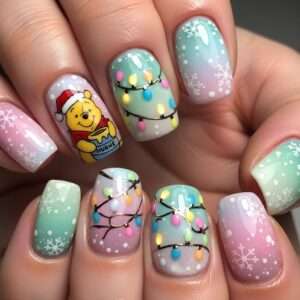 Short nails can feature Pooh holding a honey pot decorated with festive ribbons or little Christmas lights.