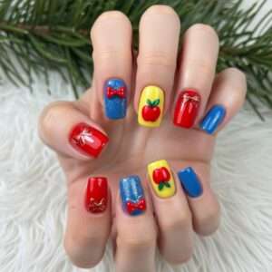 Think red, blue, and yellow nails with tiny apple accents or Snow White’s iconic bow.