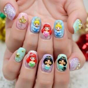 Add tiny snowflakes, glass slipper accents, or Cinderella’s castle silhouettes to make your nails feel magical and classy for the holidays.