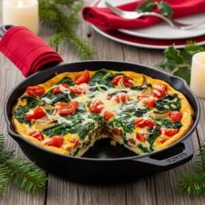 A colorful egg dish packed with spinach, tomatoes, onions, and melted cheese.