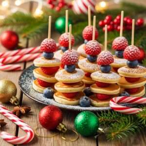 Fun, cute, and perfect for kids—mini pancakes stacked with fruit on skewers.