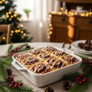 This warm, gooey cinnamon roll casserole turns a classic breakfast into a festive treat with minimal effort. Perfect for feeding a crowd!