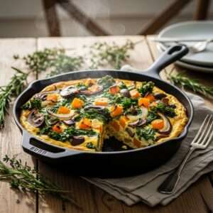 Packed with roasted seasonal veggies like butternut squash, kale, mushrooms, and caramelized onions, this frittata is both hearty and colorful.