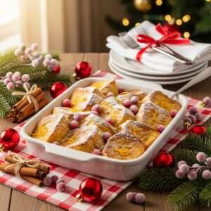 The bread is soaked in a custard mixture and baked until golden, with bursts of cranberry in every bite.