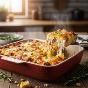 This hearty casserole layers fluffy eggs with savory sausage, melty cheese, and soft bread cubes.