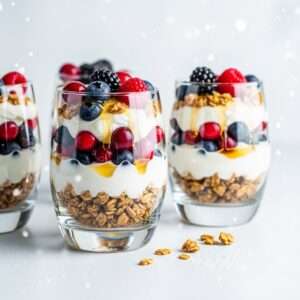 Layer Greek yogurt with seasonal berries like blueberries, cranberries, and blackberries for a balanced and colorful brunch treat.