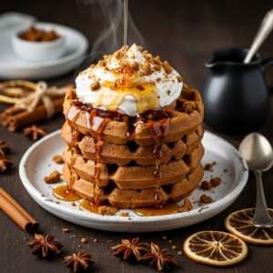 Bring the holiday spirit to the table with fluffy waffles made from molasses, ginger, cinnamon, and cloves.