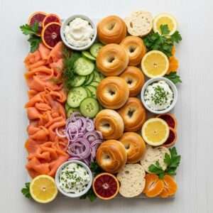 For a more elegant winter brunch, build a bagel board with smoked salmon, cream cheese, capers, red onion, cucumbers, and herbs.