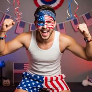 Wear American flag shorts, a white tank top, and an American flag bandana.