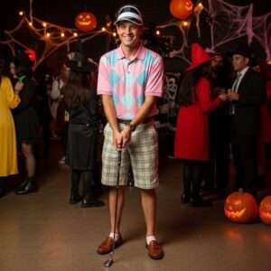 A white visor and a fake golf club complete the look. This outfit screams “I just skipped class for 18 holes.”