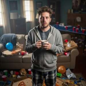 Add messy hair and carry a coffee cup or fake Pedialyte bottle.