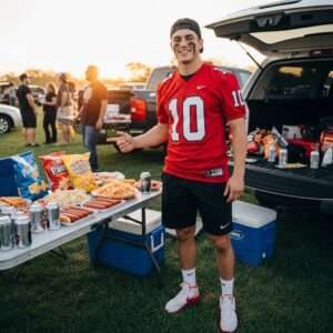 Throw on your college’s football jersey, a pair of gym shorts, and Nike sneakers.