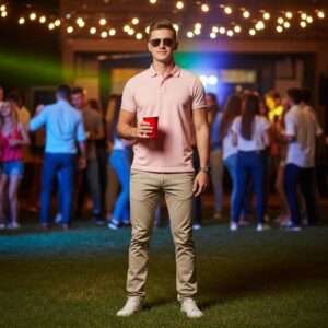 Pop your collar, grab a pair of white sneakers or boat shoes, and don’t forget your sunglasses—even at night. Add a red Solo cup for the perfect finishing touch.