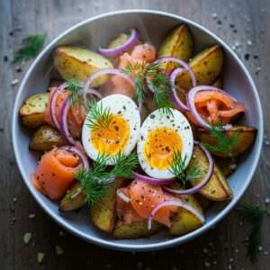 Crispy breakfast potatoes paired with smoked salmon, soft boiled eggs, red onions, and dill create an elevated winter breakfast.