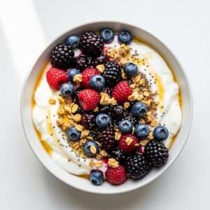 Thick Greek yogurt is layered with warm mixed berries, granola, chia seeds, and a drizzle of honey.