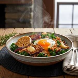 Warm brown rice or farro topped with sautéed kale, caramelized onions, roasted garlic, and a sunny-side-up egg creates a deeply nourishing bowl.