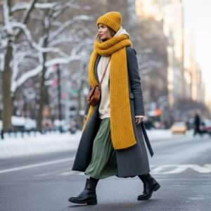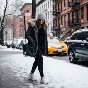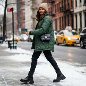 Finish with chunky sneakers or winter boots. Ideal for casual city exploration, snow days, or weekend coffee runs.