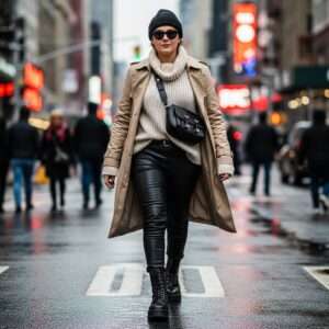 A classic trench coat paired with a chunky knit sweater and fitted leather pants creates a modern, chic vibe.