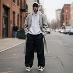 Layering a hoodie under an oversized coat combined with wide-leg trousers gives off an effortlessly cool aesthetic.