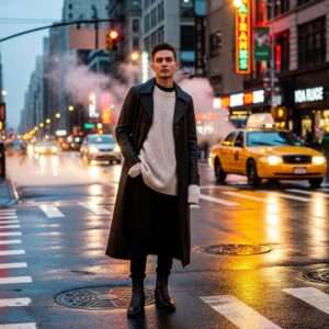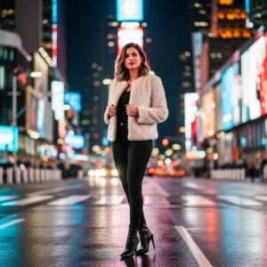 Boots and subtle jewelry complete the modern urban look. Perfect for NYC rooftop views or evening street photography.