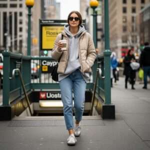 Combine practicality with aesthetic appeal using a neutral puffer jacket, oversized hoodie, and relaxed mom jeans.