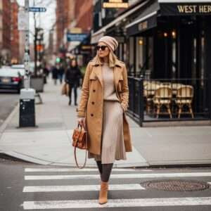 The iconic camel trench coat with a cozy sweater and pleated skirt exudes a soft, feminine aesthetic. Add opaque tights and ankle boots for warmth.