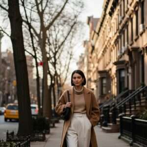 A soft camel coat over a neutral turtleneck and wide-leg pants creates an elegant, minimalist aesthetic.
