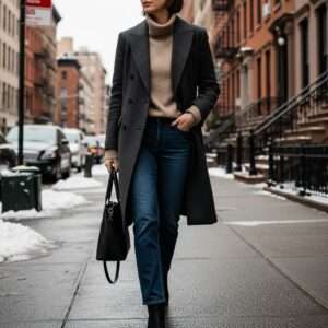 A structured double-breasted coat over a classic turtleneck and straight jeans embodies clean, minimal aesthetic winter fashion.