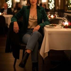 Velvet screams holiday luxury. Wear a deep green velvet blazer over a satin camisole for a dressy yet comfortable vibe.