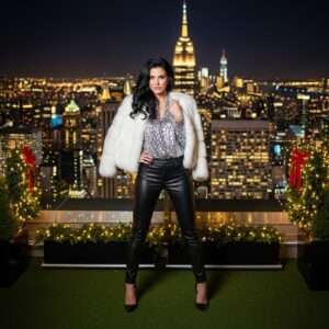 The mix of glam and texture creates an unforgettable holiday look perfect for Times Square parties or a night at The Edge.