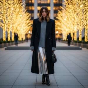 This outfit captures the shimmering NYC holiday aesthetic and works great for events at Lincoln Center or holiday concerts.